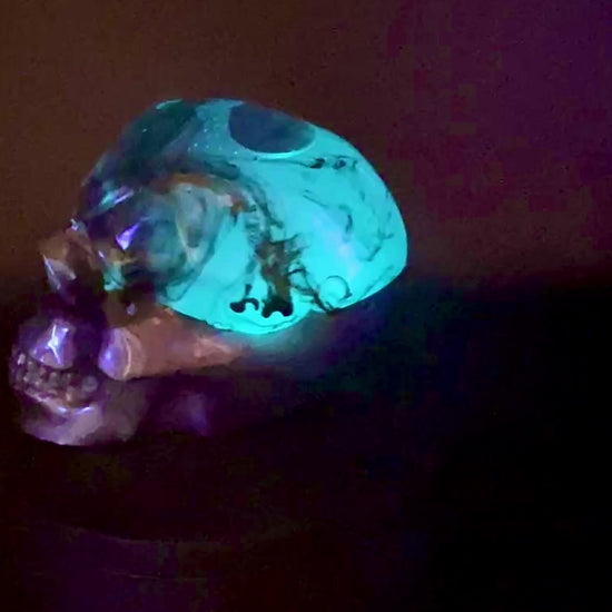This handcrafted resin skull from Lustre Lane features a striking blend of deep pearlescent black and swirling aqua tones that shimmer beautifully in the light. By day, the marbled finish reveals rich, fluid depth. By night, the top of the skull transforms with a bright aqua glow, creating an ethereal, glow-enhanced centerpiece.
